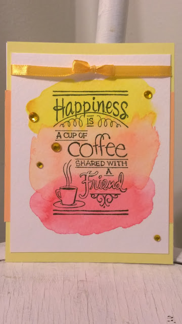 One of my favorite stamps, "Happiness is a cup of coffee shared with a friend." This background was created using acrylic paint drips after creating an acrylic pour canvas painting. Click here to see some of my acrylic creations!
